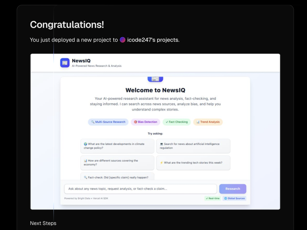 我们将使用 Bright Data 与 Vercel AI SDK 构建一套完整的 AI 新闻研究助手 NewsIQ。我们会创建一个能够处理任意来源新闻并通过对话界面提供智能分析的解决方案。