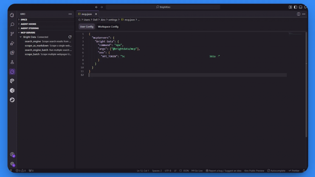 在这一引导部分,你将学习如何安装并配置 Kiro 与 Bright Data 的 Web MCP 服务器。最终,你将拥有一个能够在编码工作流内直接访问和处理实时网页数据的 AI 开发环境。
