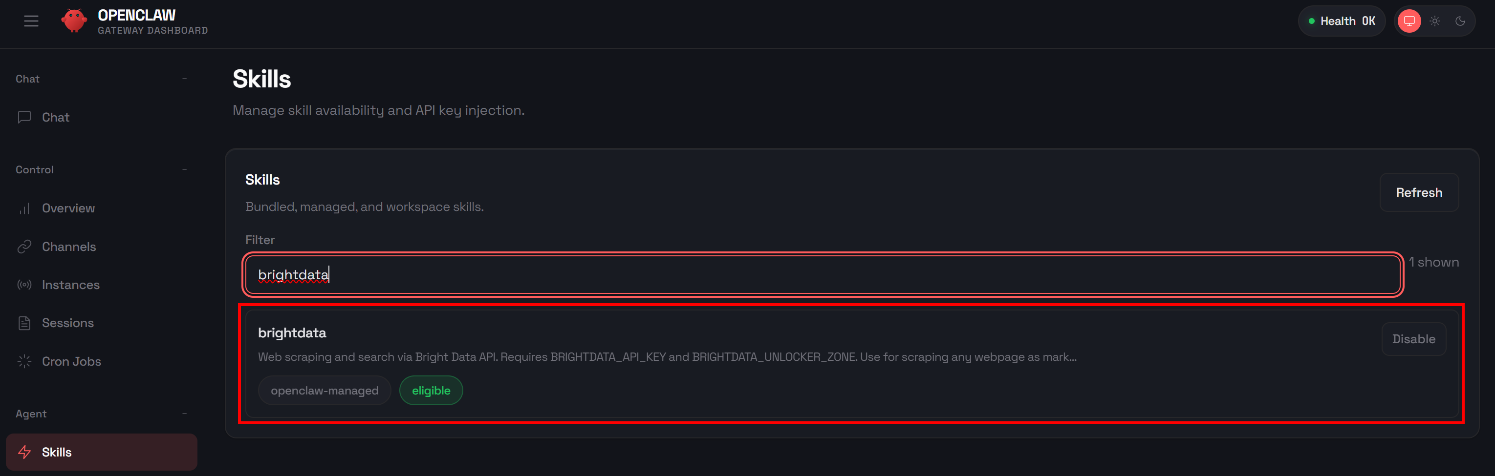 如果你进入 Control UI 的“Skills”页面并搜索“brightdata”,你应该会看到: