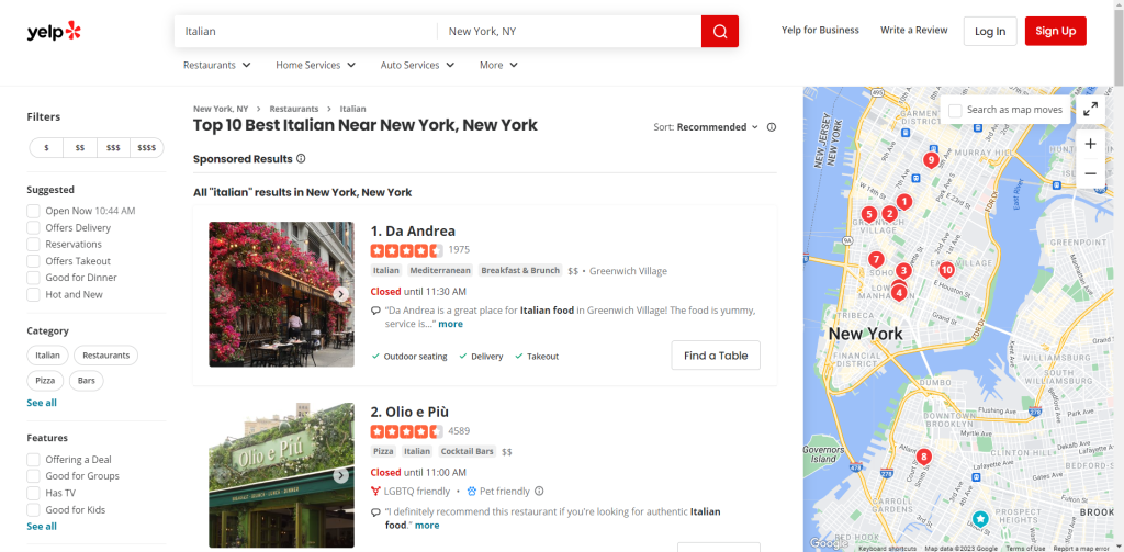 浏览 Yelp 并识别您想要抓取的页面。在本指南中,您将学习如何从纽约评价最高的意大利餐厅列表中检索数据: