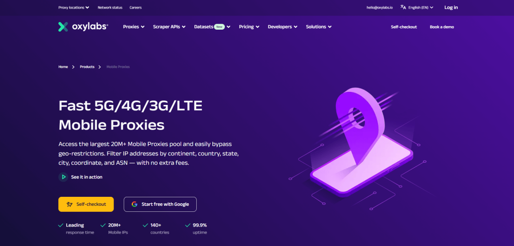 | Oxylabs | LTE、3G、4G、5G | 2000万+ | 140 | 大洲、州、市、坐标、ASN | 99.9% | — | 3500+ | 4.6/5 | ✔️ | ❌ | $9/GB |