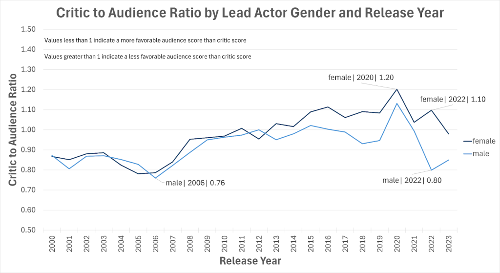 在过去24年中,观众一直倾向于更青睐男性主演的电影,在其中20年中,他们的评分高于女性主演电影。女性主演电影在2004年、2005年和2012年获得了观众更高的评分。2008年两者打成平手。