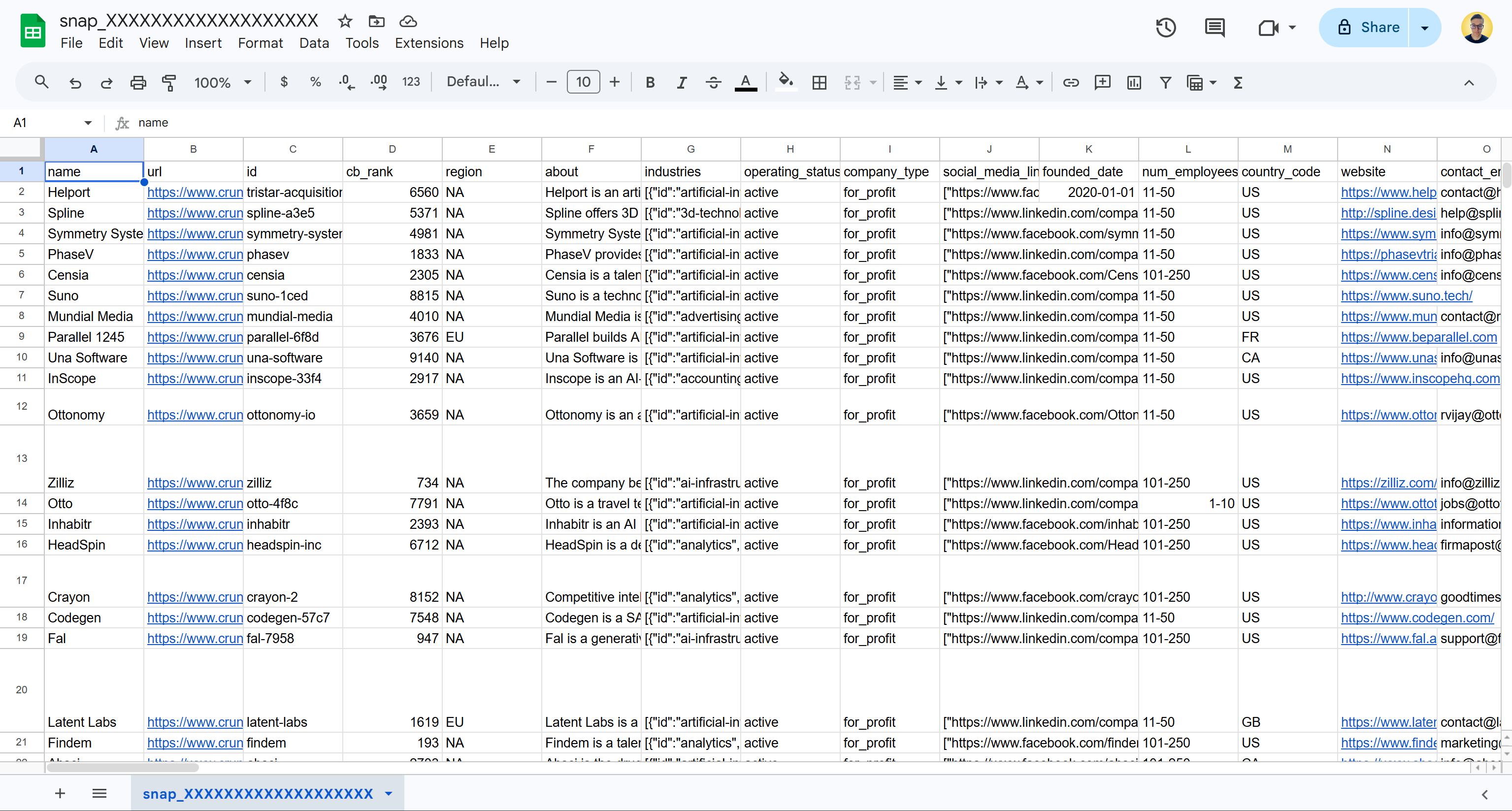 你的浏览器将下载一个名为 snap_XXXXXXXXXXXXXXXXXXX.csv 的文件,其中包含筛选后的 Crunchbase 数据。完美!