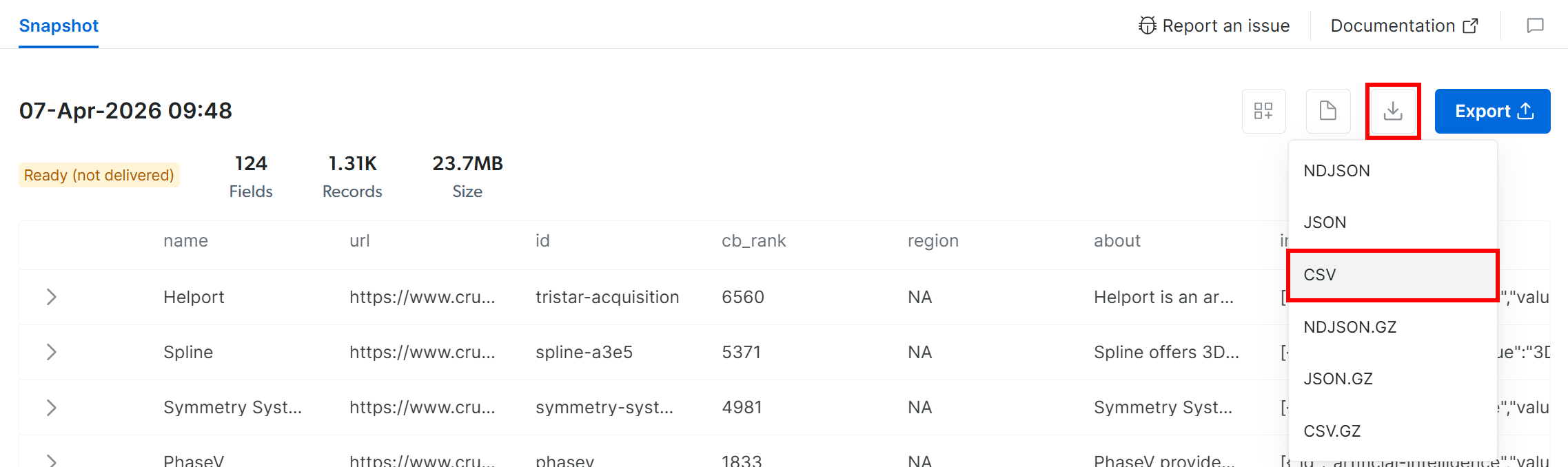 要检索快照,点击“Download”图标并选择“CSV”选项: