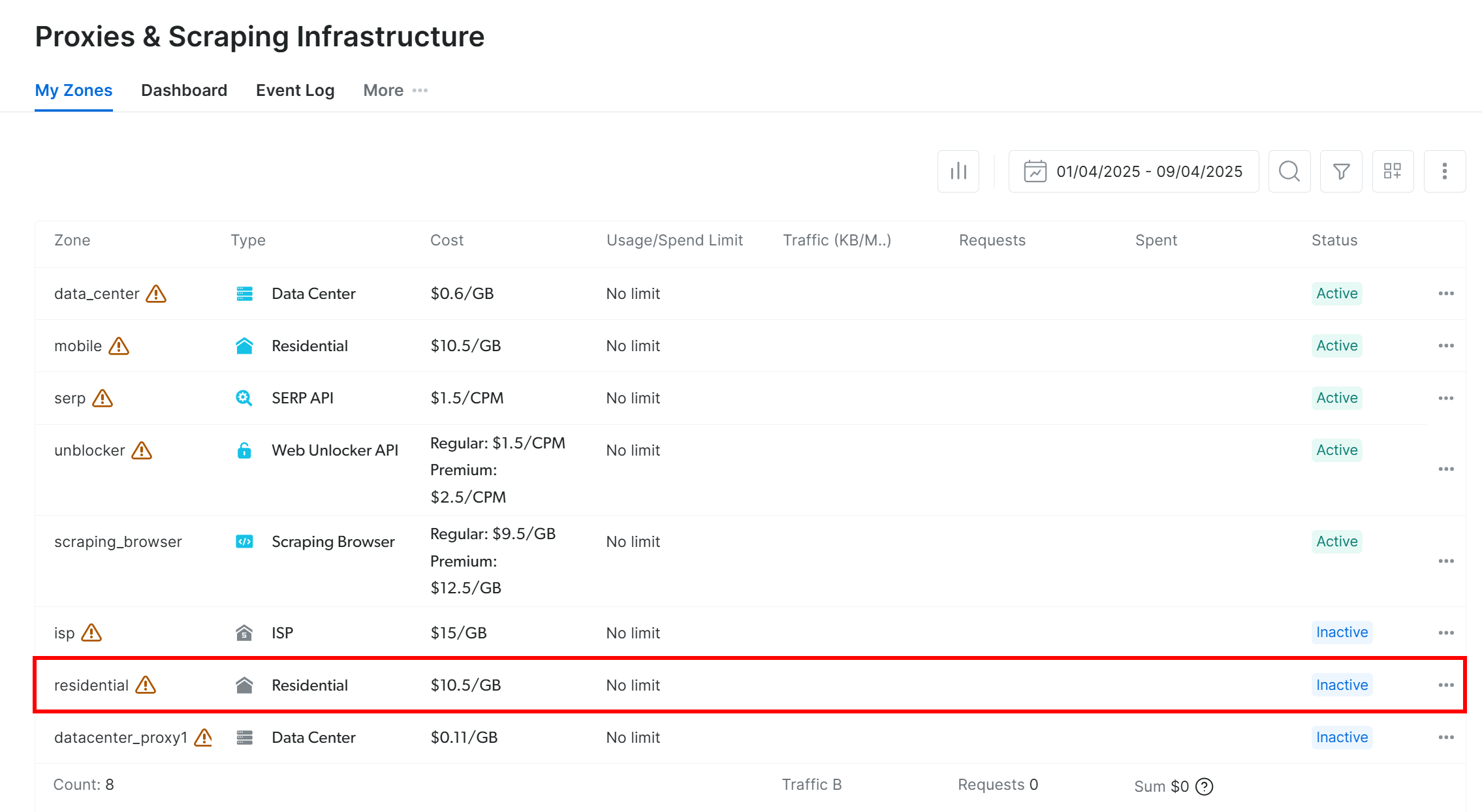 目前市面上有多种类型的代理。若想避免封禁,就必须使用高质量的服务商提供的真实轮换代理(rotating proxies),例如 Bright Data。