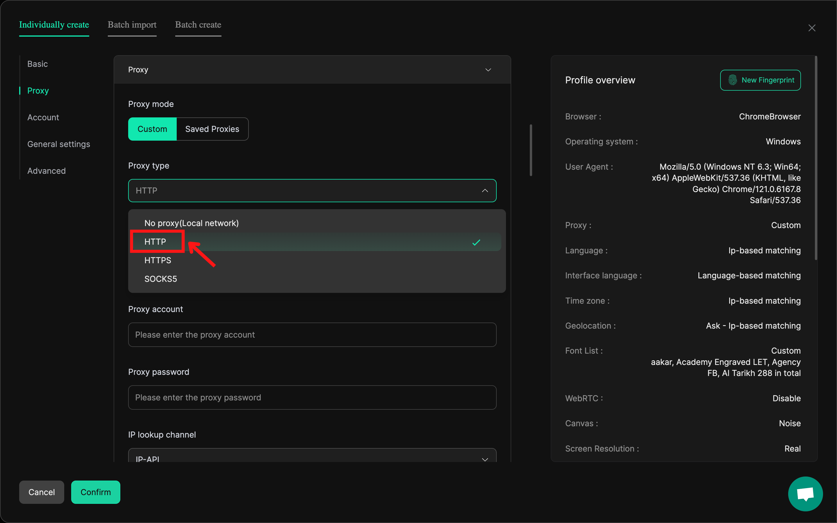 - 在 ‘Proxy Type’(代理类型)下拉菜单中,选择 ‘HTTP’。
