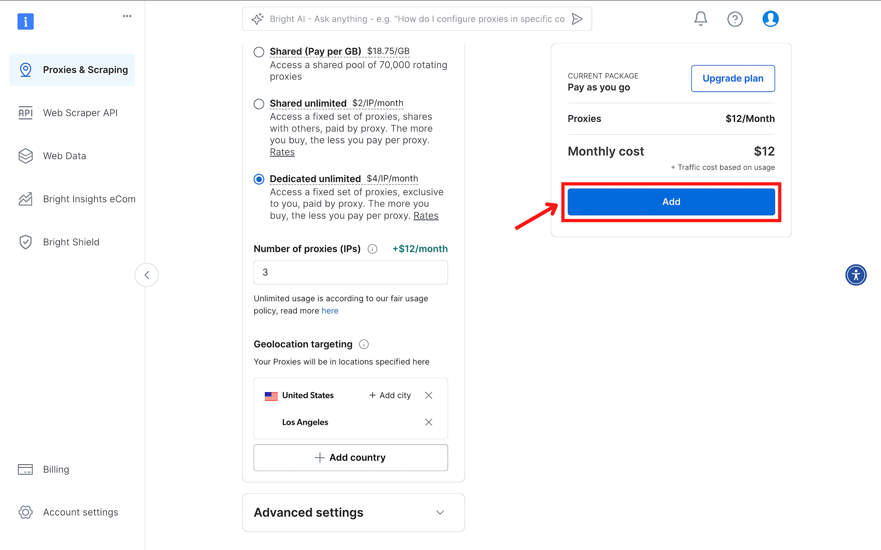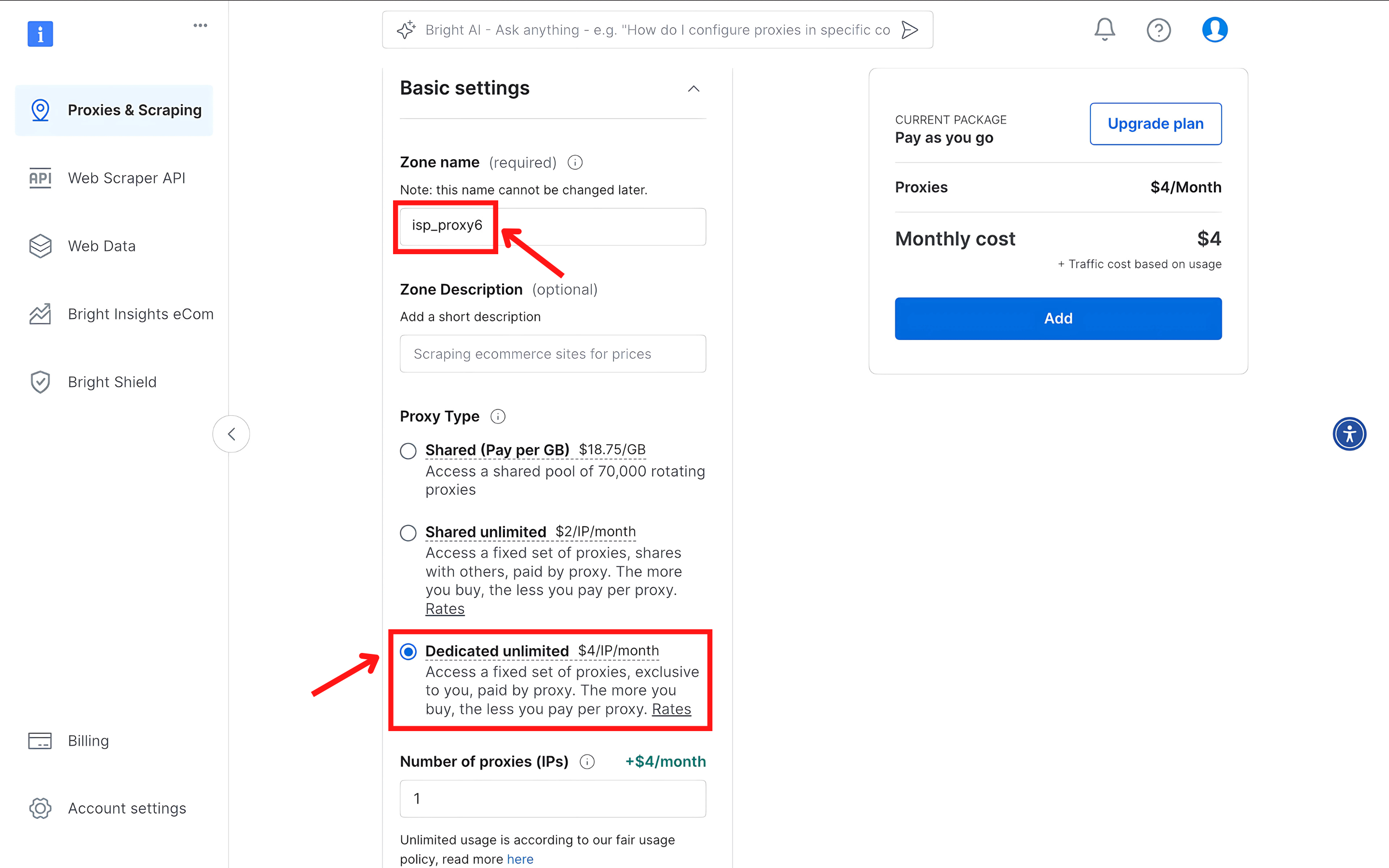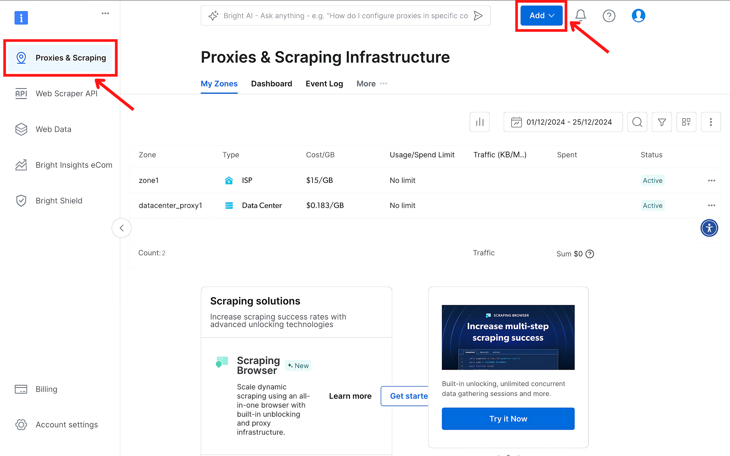 - 进入 “Proxy & Scraping”(代理与采集)板块,点击 Add(添加)按钮创建一个 Zone。