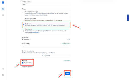 请确保添加你的目标域名,或选择“All domains(所有域名)”,以便使用同一个 IP 定向多个站点。