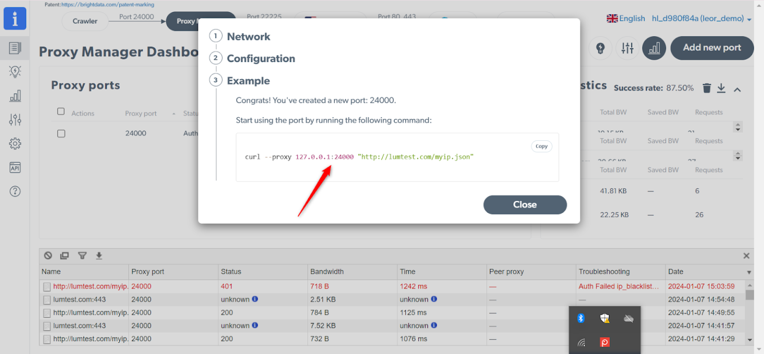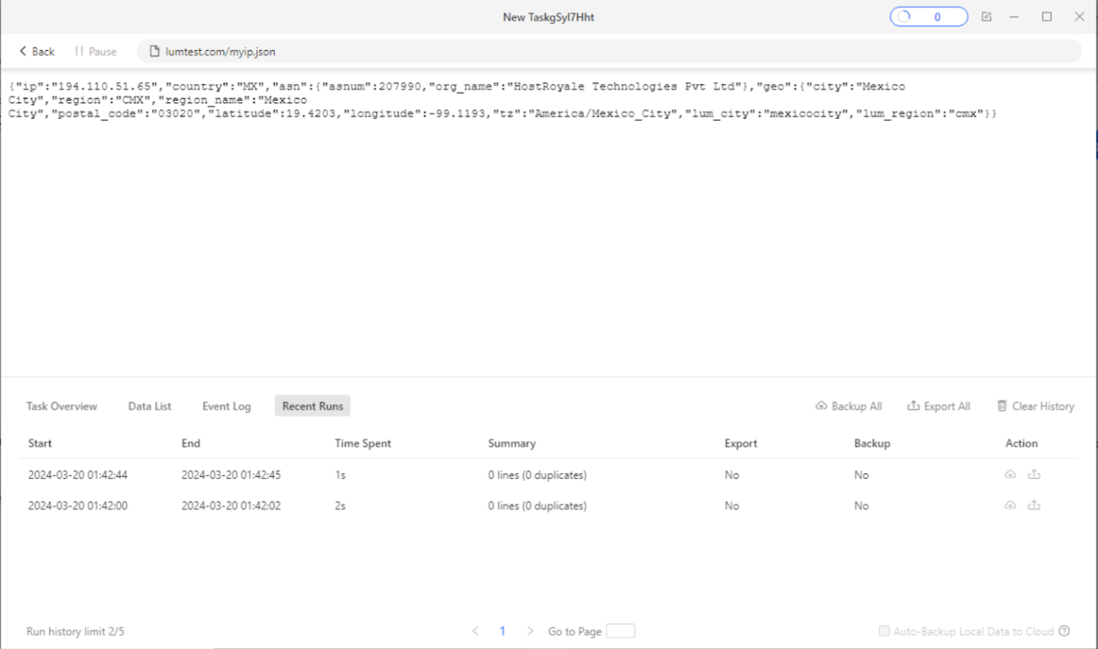 要确认 Bright Data 代理已生效,你可以运行一个任务并使用此 URL:lumtest.com/myip.json
