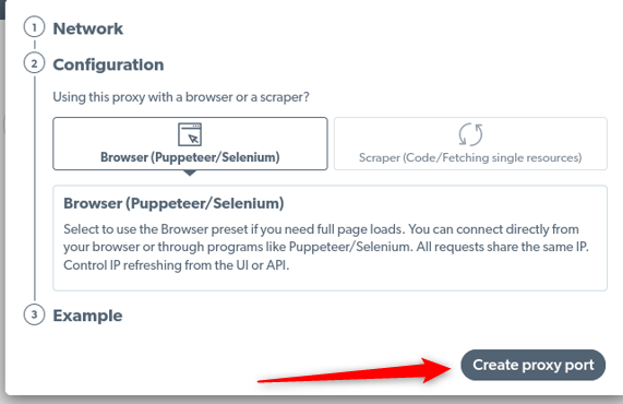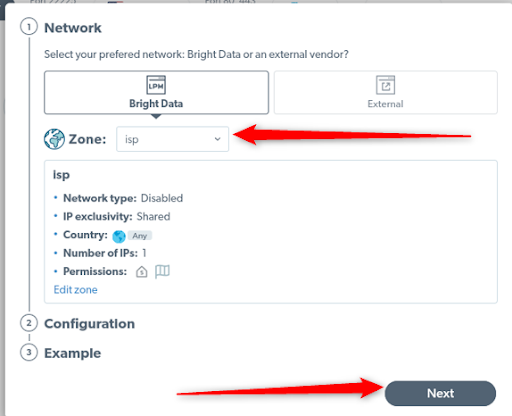 打开 Proxy Manager 控制台并点击 Start(开始)。在这里你可以看到首选网络,默认将是 Bright Data,以及 zones 下拉菜单。选择 IPS Proxy 1 并点击 next(下一步)。