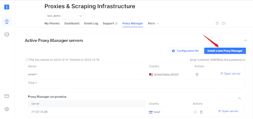 返回“Proxies and Scraping Infrastructure”(代理与采集基础设施)部分,选择“Proxy Manager”标签页并点击“Install a new Proxy Manager”(安装新的 Proxy Manager),然后向下滚动到安装区域。