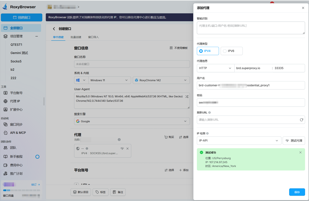 返回 RoxyBrowser 并将复制的用户名和密码粘贴到相应的字段中。单击「测试代理」按钮,并确保看到“测试成功”消息。 单击「保存」浏览器配置文件。