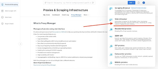 要创建 Web Unlocker 代理,请注册 Bright Data。登录后,在“Add”(添加)菜单中选择 Web Unlocker:
