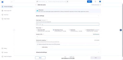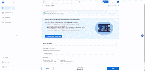 注册后,在 Bright Data 控制台中进入“Proxy & Scraping Infrastructure”(代理与采集基础设施)部分,并Add(添加)一个专用于代理使用的Zone。