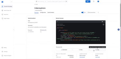 在“Proxy Manager”中配置完参数后,返回 Bright Data 平台。此时你需要找到并复制为该 zone 生成的代理值。该值将在后续 Linken Sphere 浏览器连接设置中使用。
